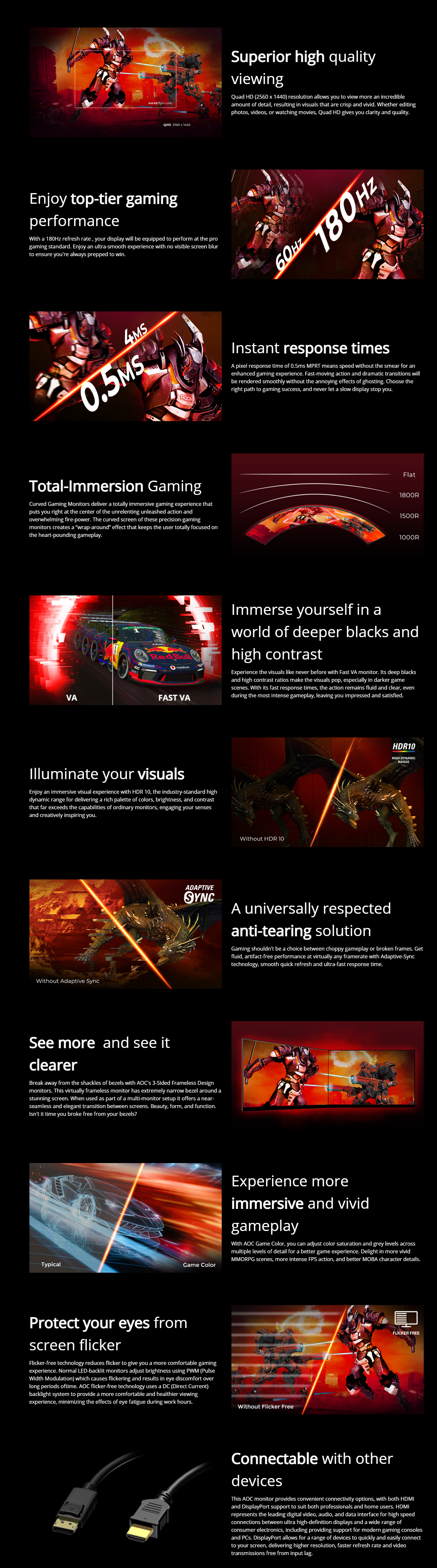 AOC CQ32G4E 31.5″ QHD 180Hz 0.5ms HDR10 1500R Curved Adaptive Sync Gaming Monitor Specs