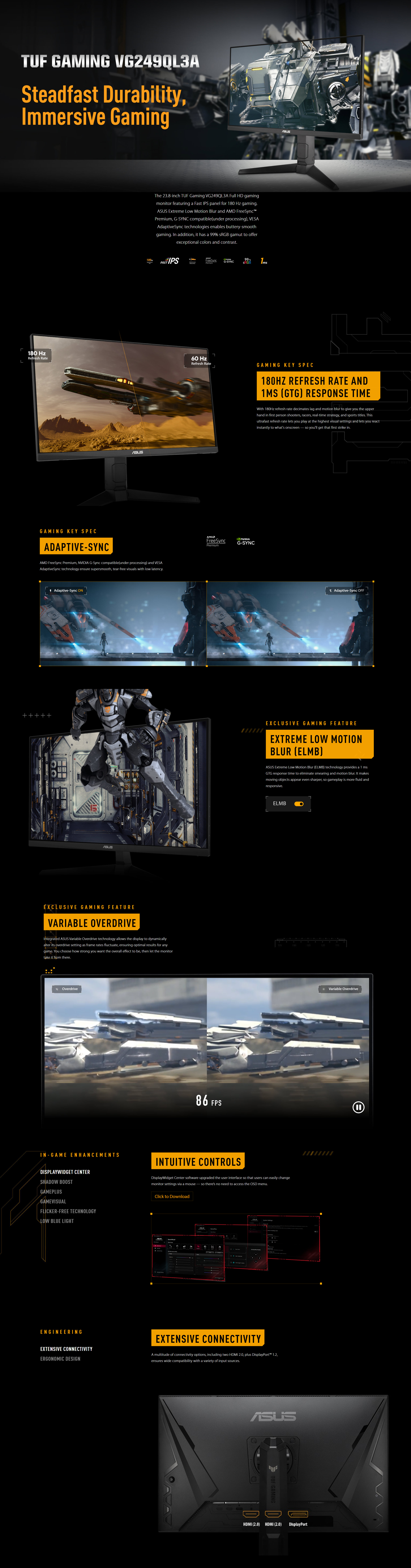 Home » Products » ASUS TUF Gaming 24″ (23.8″ viewable) 1080P Monitor (VG249QL3A) – Full HD, 180Hz, 1ms, Fast IPS, ELMB, FreeSync Premium, G-SYNC Compatible, Speakers, DisplayPort, Height Adjustable