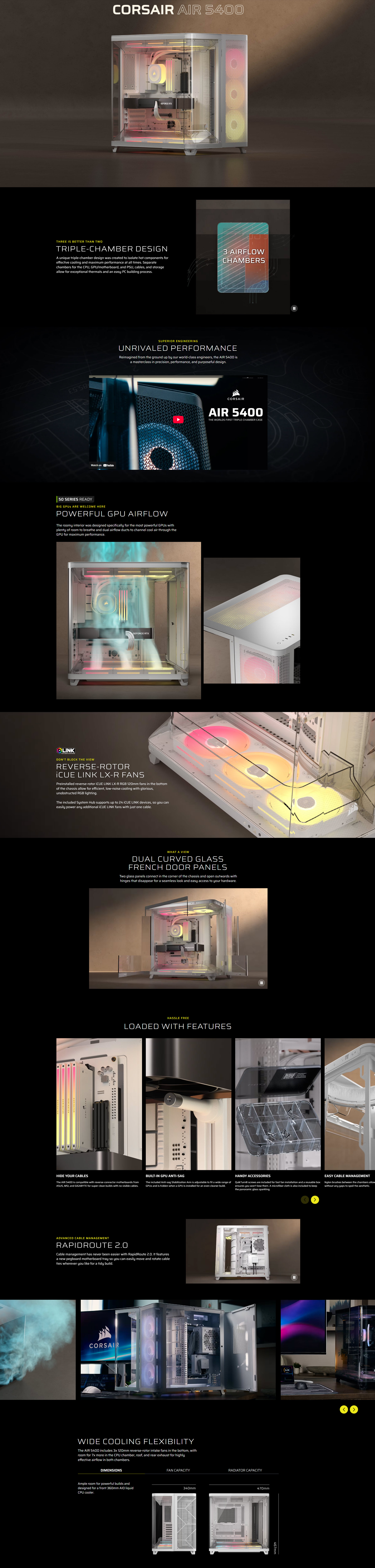 Home » Products » Corsair AIR 5400 LX-R ARGB iCUE Link Triple Chamber Mid-Tower Computer Case 3x RS-R 120mm Pre-Installed Fans Up to 360mm Radiator & 10x Fan Support Tempered Glass Panel White