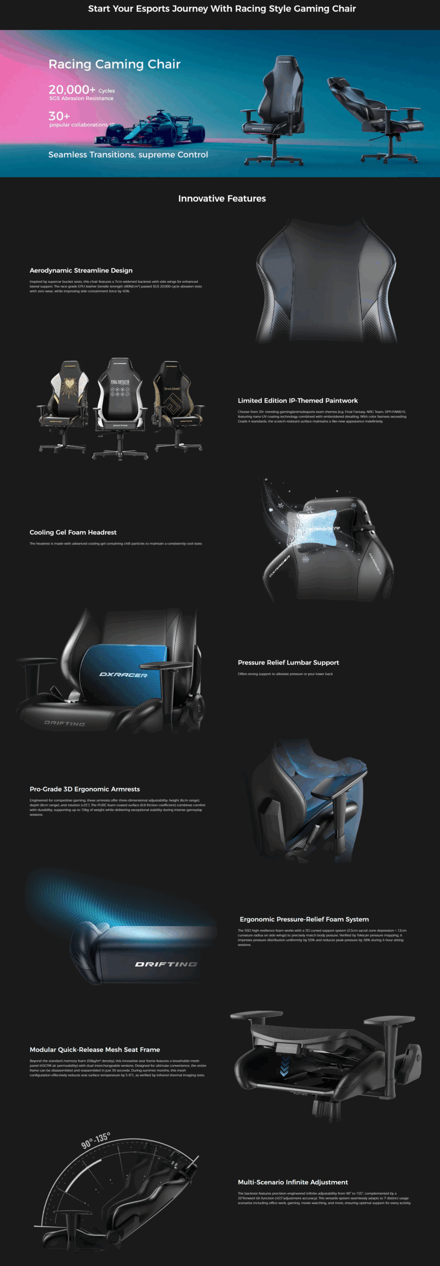 • Extra higher backrest to save neck and spinal, Flexible seat back