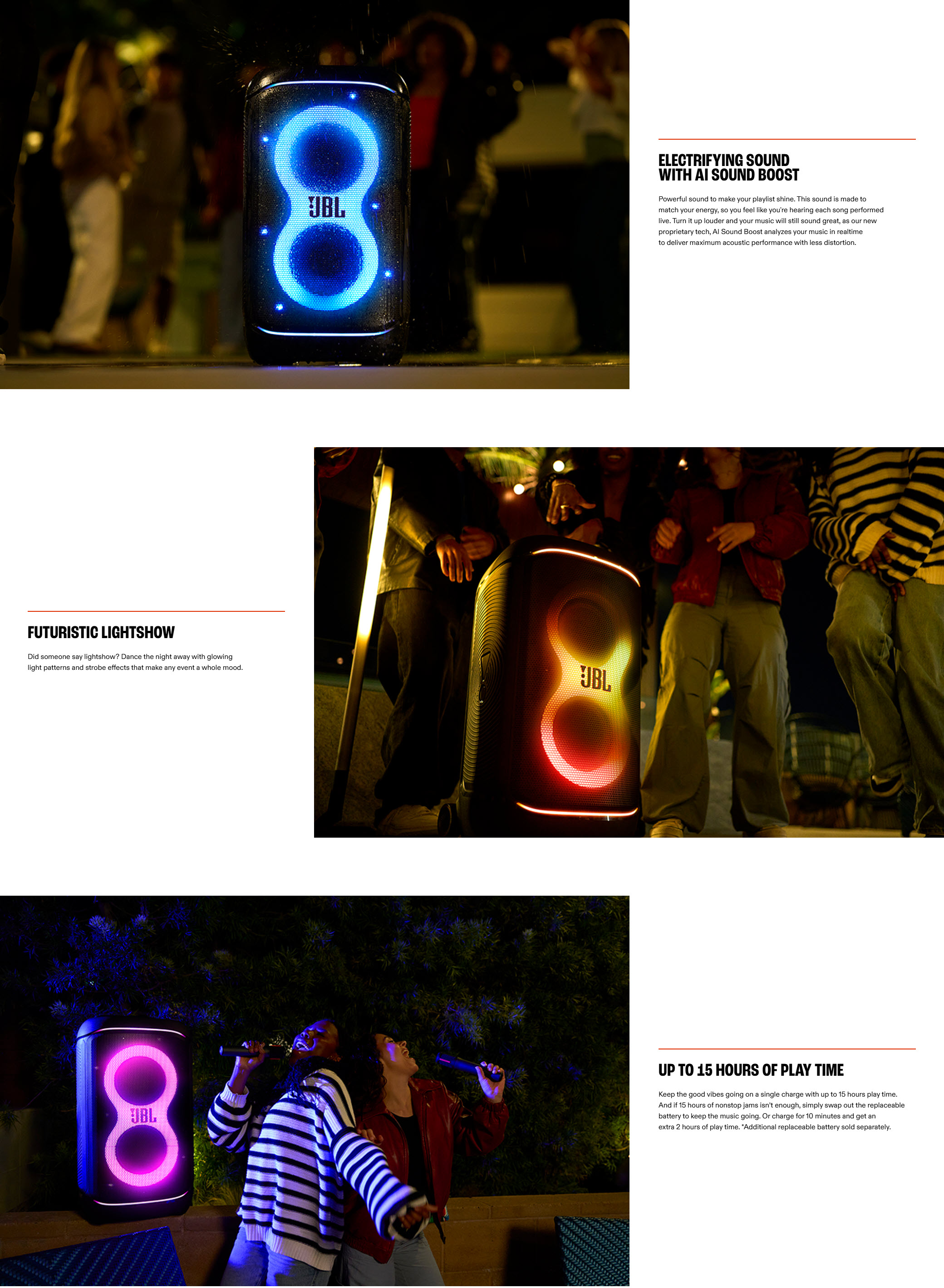 • Electrifying sound with AI Sound Boost: Advanced proprietary technology analyzes music in real time to maximize acoustic performance and reduce distortion; powered by 400W RMS output.