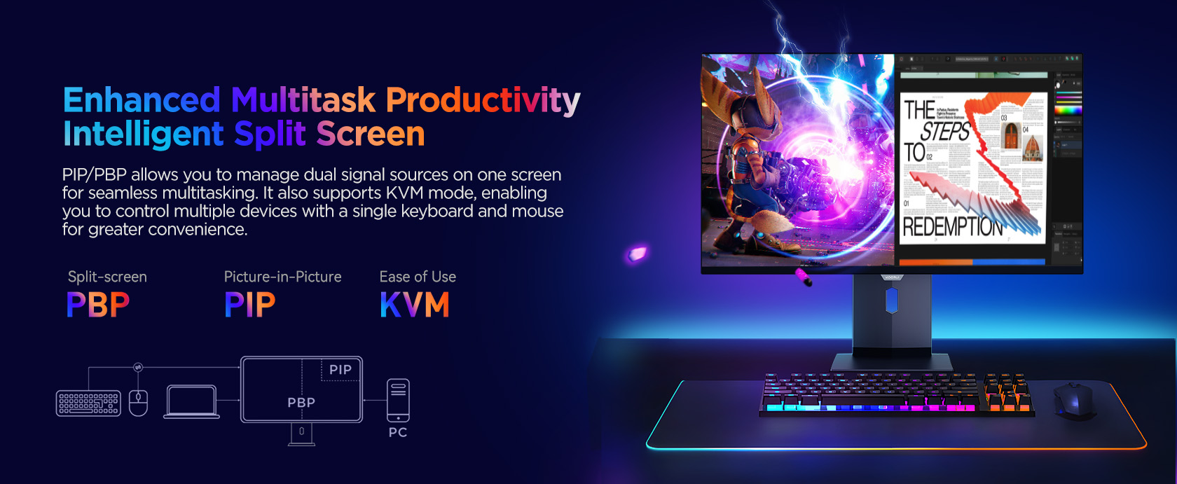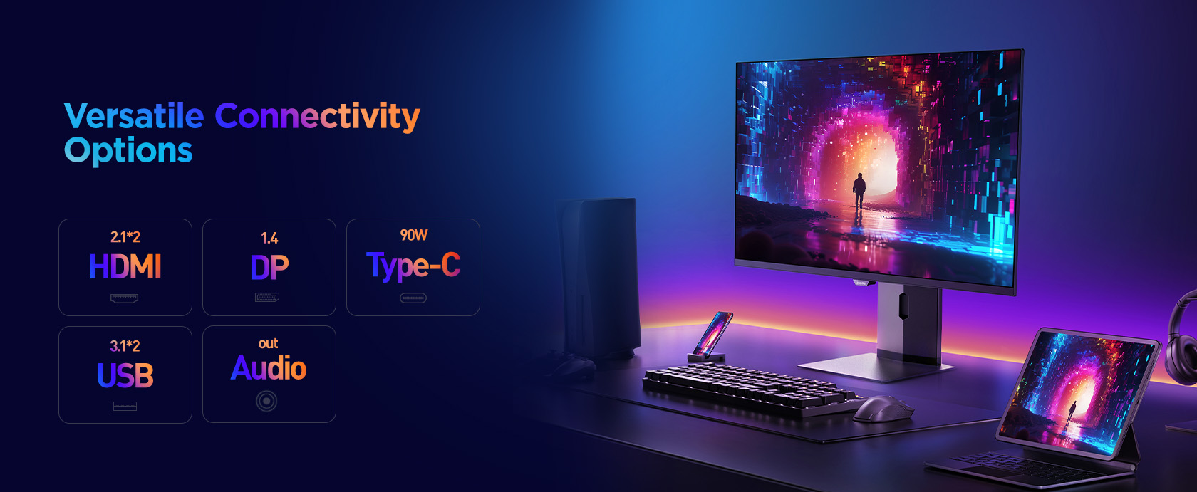 • Versatile Connectivity: Equipped with DisplayPort 1.4, HDMI 2.1, TYPE-C, and USB-A/B ports-ideal for PCs, PS5, Xbox Series X, and workstations. Quickly switch between devices without unplugging cables.