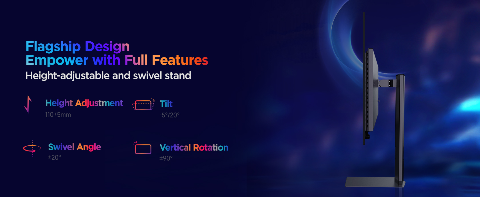 • Ergonomic Adjustments: Features tilt -5~20°, swivel -20~20°, pivot±90°, and height adjustment 110mm with VESA 100x100mm compatibility for ultimate viewing comfort and flexible mounting options.