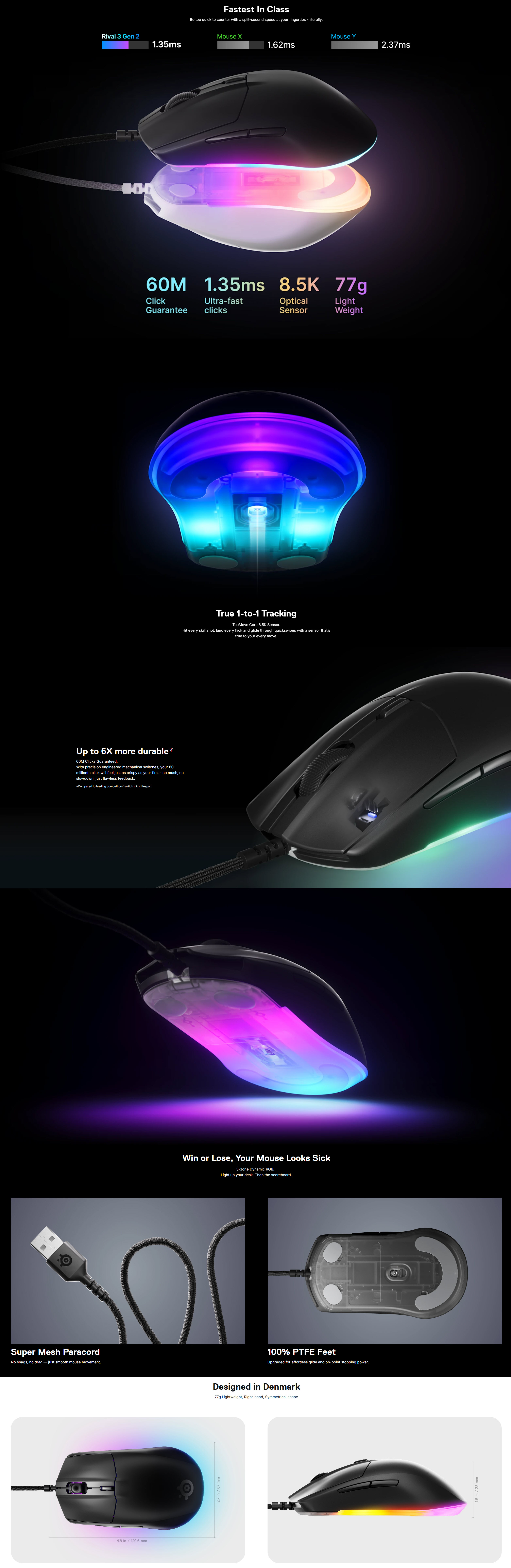 SteelSeries Rival 3 Gen 2 RGB Gaming Mouse 8500 DPI TrueMove Core Optical Sensor 60 Million Click Durability Low Latency 77g Lightweight 100% PTFE Feet RGB Black