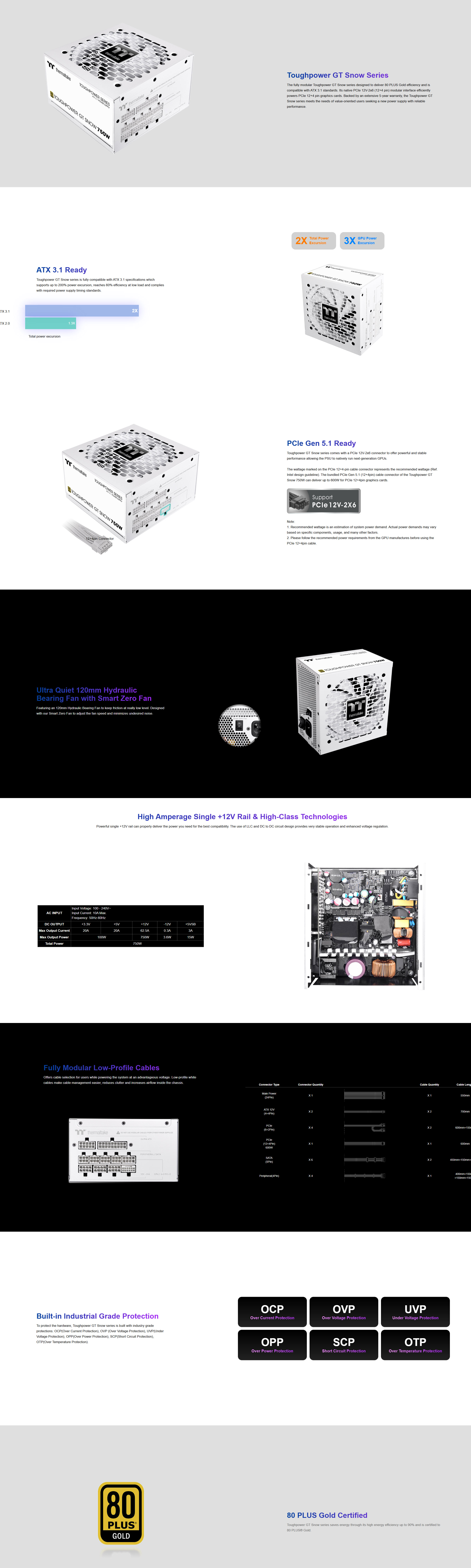 Thermaltake ToughPower GT 750W ATX 3.1 Standard Power Supply – 80 Plus Gold Efficiency Fully Modular, Smart Zero Fan Native 300W PCIe 5.1 Connector – Snow