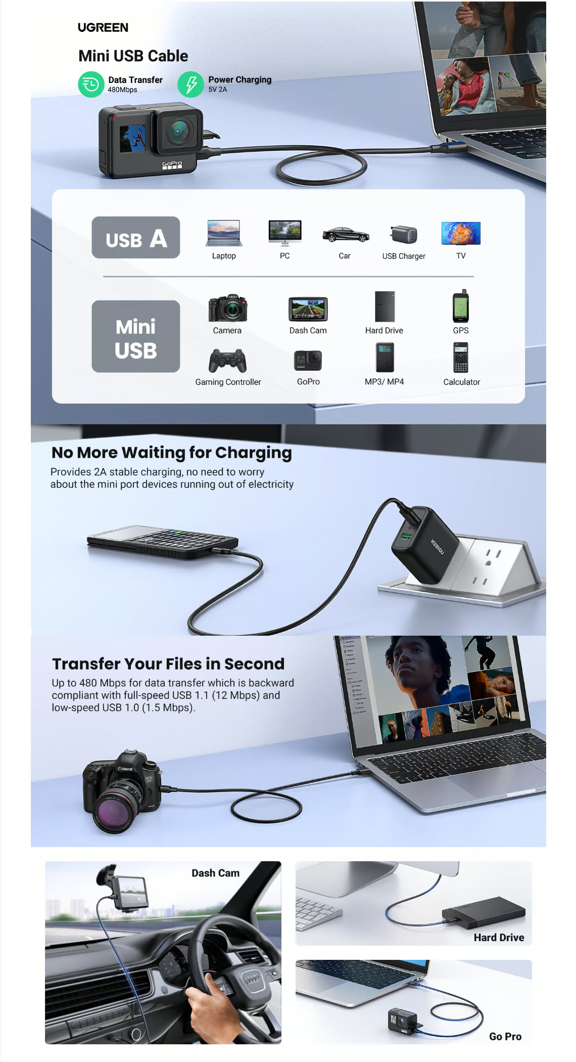 UGREEN 30472 USB 2.0 Male to Mini 5-Pin Male Cable (2 Meter)