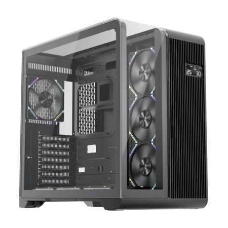 • Water cooling ready – Top can fit up to 360mm, MB side support up to 280mm liquid cooler and the case can accommodate up to 9 fans (3x ARGB fan pre-installed), providing excellent cooling performance and ARGB lighting effects.